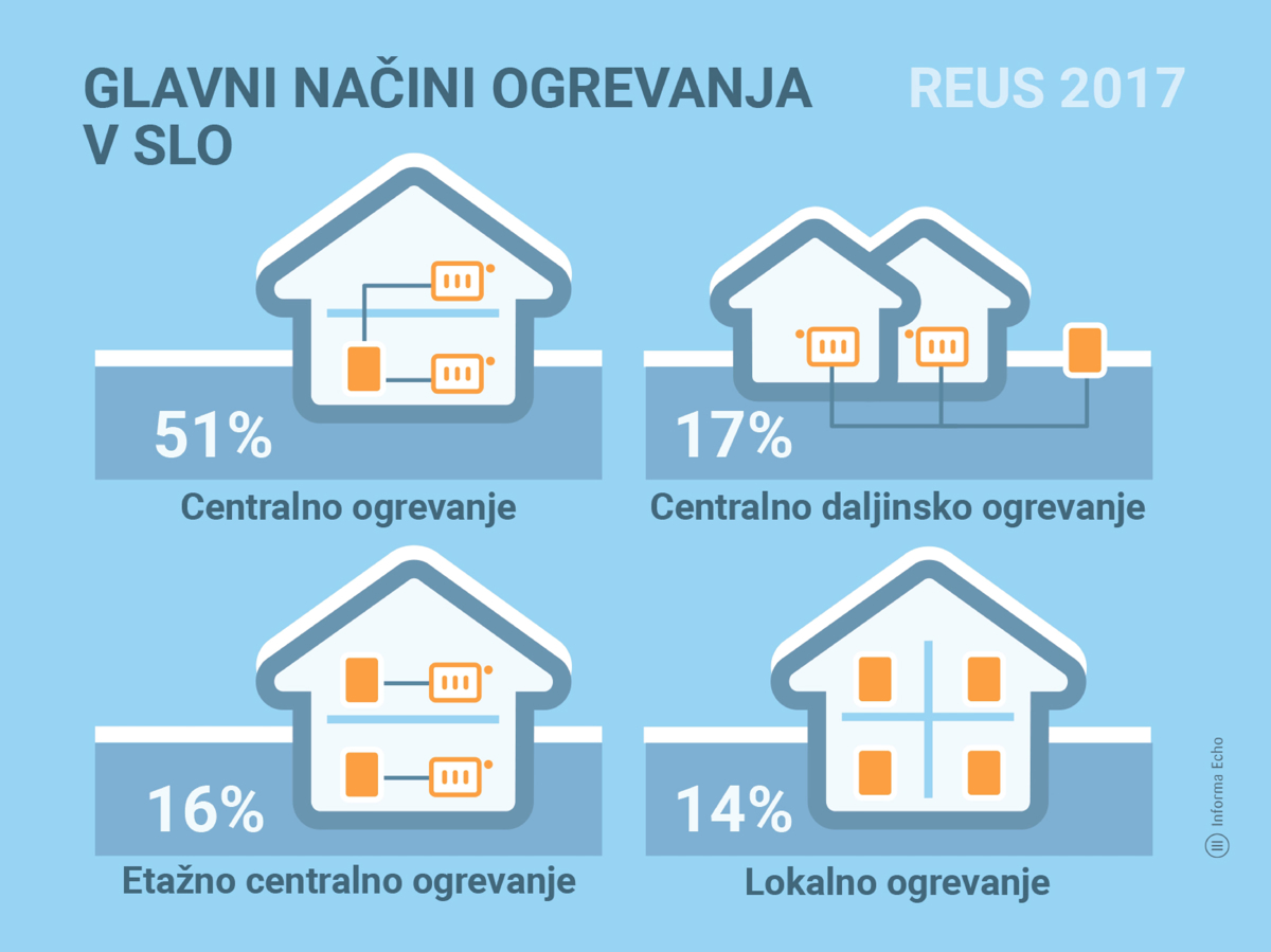 "Povprečna slovenska družina porabi za ogrevanje dobrih 1500 evrov med ogrevalno sezono. Med Primorsko in zgornjesavsko regijo je razlika v stroških ogrevanja skoraj 1000 evrov. Ob primerni izbiri načina in naprave za ogrevanje, ustrezne izolacije, energijsko učinkovitih oken lahko pri gretju prostorov veliko prihranimo z ustreznim ravnanjem," pravi Rajko Dolinšek, direktor Informa Echo in vodja projekta REUS. V Sloveniji razlikujemo štiri glavne načine ogrevanja: centralno ogrevanje (toplota se proizvaja na enem mestu za celotno stavbo, ki je povezana z radiatorji), centralno daljinsko ogrevanje (toplota se proizvaja zunaj stavbe v posebnem obratu, ki oskrbuje več stavb ali naselij), etažno centralno ogrevanje (toplota se proizvaja na enem mestu za stanovanje, torej ima stanovanje svoj vir toplote) in lokalno ogrevanje (vir toplote je v prostoru, ki ga ogrevate; sem spadajo denimo kamini, električni radiatorji).