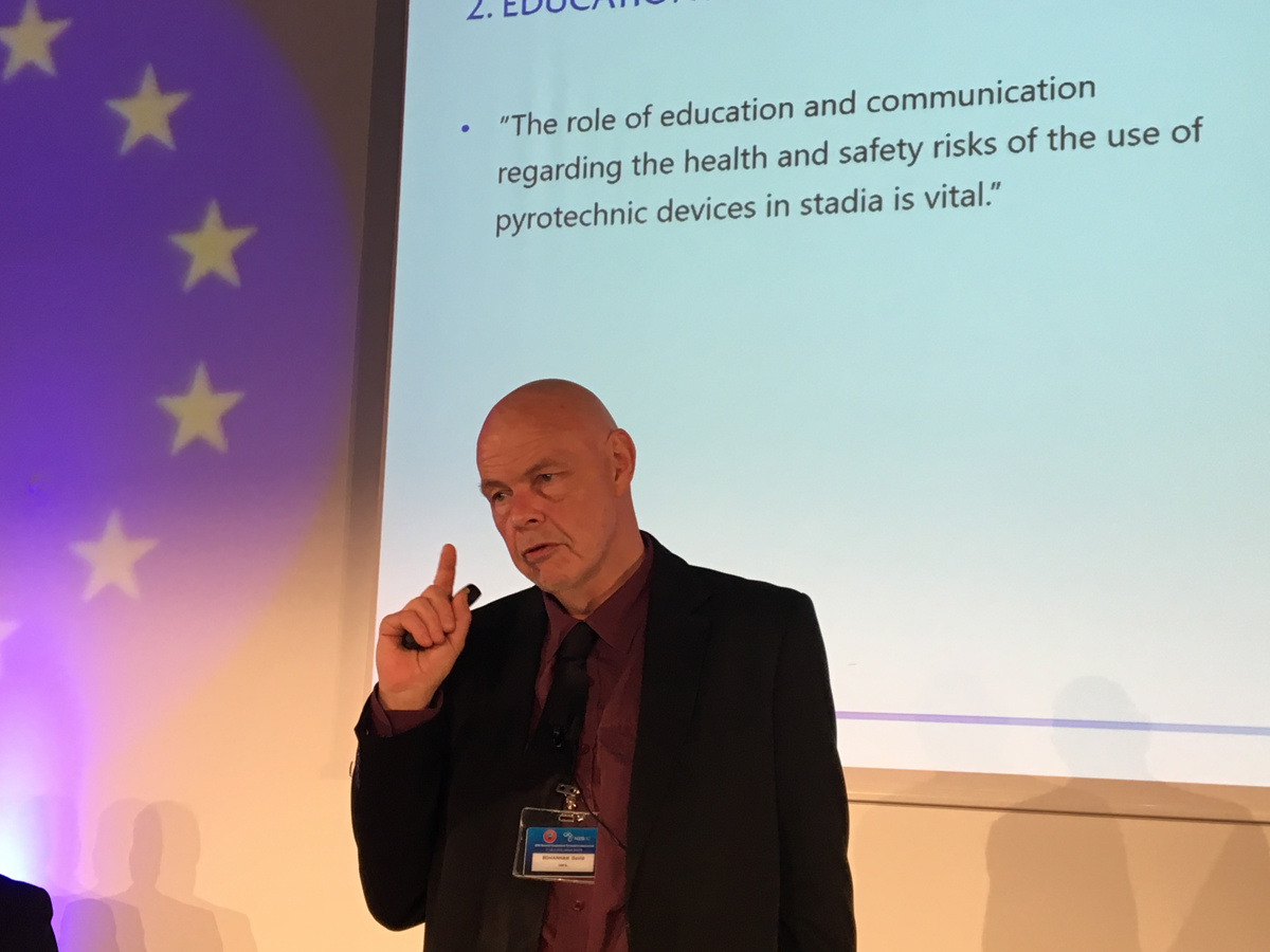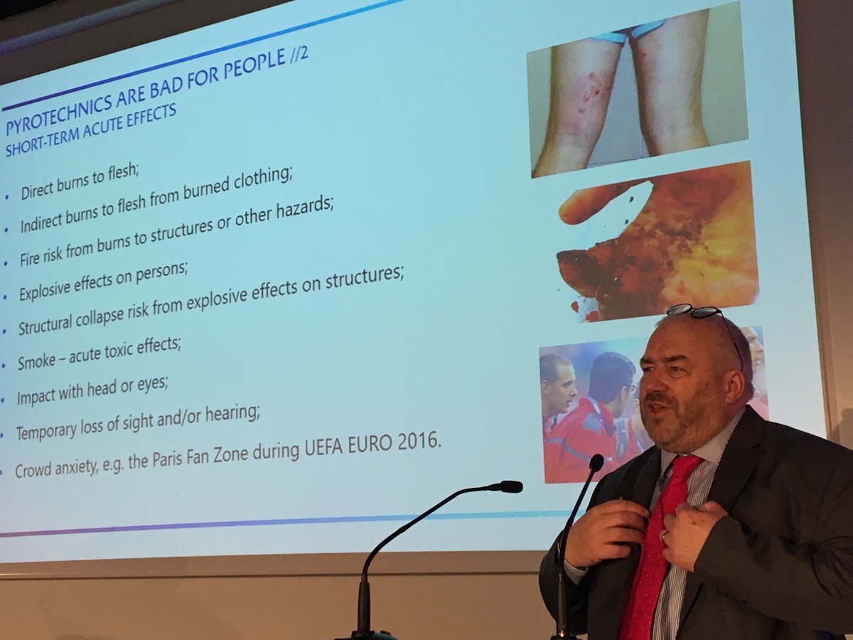 Uefa je zaznala resne incidente tudi v Sloveniji, je dejal voditelj seminarja, profesor dr. Steve Frosdick, dolgoletni policijski uradnik v Londonu, profesor kriminologije in avtor knjig s področja varnosti in nogometnega huliganizma. Prikazal je nekaj incidentov s tekme Maribora in Olimpije. Dr. Tom Smith, kemik z oxfordskim pedigrejem, ki se s preučevanjem pirotehnike znanstveno ukvarja vse življenje, je predstavil posledice rabe, ko so ljudje ostali brez prstov, oglušeli zaradi jakosti pokov, kako so z baklami zadevali igralce. Posebej izpostavljeni so vratarji, le malo pa jih ve, da je dim zaradi toksičnosti zelo nevaren za pljuča: