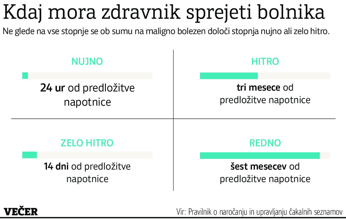 Pri osebni zdravnici sem pred tremi tedni dobila napotnico z oznako zelo hitro in poklicala na mariborsko urologijo, da se naročim," pripoveduje starejša Ptujčanka. "Tam so mi povedali, da programa še nimajo, in mi svetovali, naj pokličem svojo zdravnico in preverim, ali je moj primer lahko uvrščen pod nujno ali hitro. Nato so me že poklicali iz mariborske bolnišnice in mi prijazno svetovali, naj počakam, saj da bom vsa navodila v zvezi s pregledom prejela po pošti. No, zdaj je minil že lep čas in ne vem, kaj se je zgodilo z napotnico," izkušnje z napotnico z novo uveljavljeno oznako zelo hitro razlaga Ptujčanka, ki bo v teh dneh skušala ugotoviti, kaj se je zgodilo. Primer je daleč od osamljenega, saj se v treh tednih od uveljavitve novega pravilnika in po noveli zakona o pacientovih pravicah težave kar vrstijo. Svojo izkušnjo je izrazila tudi bralka, ki je opozorila, da so v pediatrični ambulanti kljub napotnici z oznako zelo hitro naročeni šele čez dva meseca in ne čez dva tedna, kot predvideva ta oznaka: "Niso mi podali odgovora, zakaj je datum tako pozen in kam se lahko alternativno obrnemo, ali na urgenco ali k osebnemu pediatru. Ne mislim, da so za to krive samo ambulante. Tisti, ki je potrdil novelo, bi moral podati načrt, kako se bo izvajala. Zdravniki specialisti menda ne stojijo v vrsti in čakajo na nove paciente!"